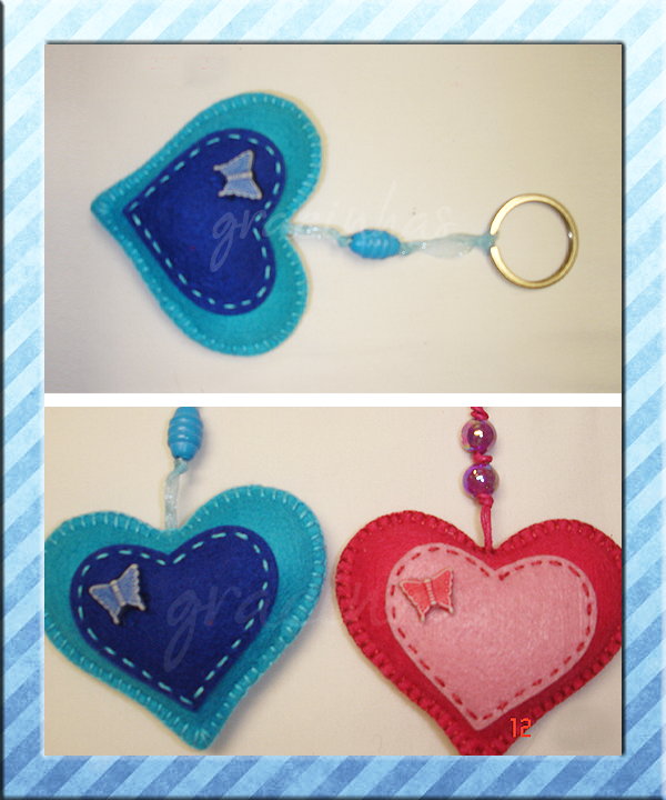 Os moldes utilizados na confecção dos cachorros foi encontrado na net (desconheço o autor) e os adereços são de minha autoria. A coleira é em pele e, em cada uma, coloquei um pequeno guizo (se a carteira das destinatárias do porta-chaves estiver tão arrumada quanto a minha, penso que o guizo pode ser de grande ajuda para encontrar as chaves). O "coraçãozinho", costurado com "ponto palito", também ficou engraçado, não acham?