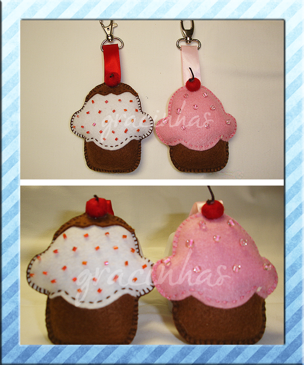 É o caso do feltro. As cores e o toque do feltro sempre me encantaram mas só ultimamente o tenho utilizado como material de trabalho. Comecei com a gatinha para pendurar na maçaneta da porta (já publicada anteriormente) e agora fiz um conjunto de porta-chaves.