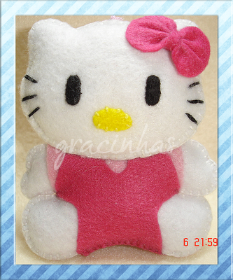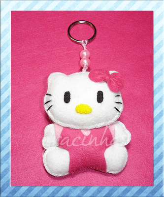 Já encontrar moldes para fazer a "Hello Kitty" foi bem mais fácil, pois na net encontram-se muitos! Uns minutos de pesquisa e lá estava um molde que depois adaptei (não consigo pegar num molde e segui-lo direitinho sem fazer alterações...). E aqui está a famosa gatinha vestida de cor de rosa, em versão porta-chaves mas que pode também ser usado para pendurar numa bolsa.