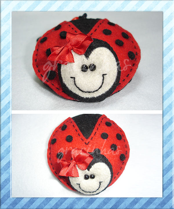 Como não encontrei um molde de joaninha que se adaptasse à imagem que idealizei para o porta-chaves decidi fazer o meu próprio molde, tendo como fonte de inspiração algumas imagens que vi na net. Os moldes são muito simples: 2 círculos grandes (corpo da joaninha) e 2 outros mais pequenos (cabeça). A composição da figura também não foi particularmente trabalhosa. No entanto, como foi a primeira joaninha que fiz tive que usar de um pouco de paciência. A boca foi bordada com linha preta e fiz o lacinho da cabeça com um bocadinho de fita de cetim vermelha. O resultado final foi este.