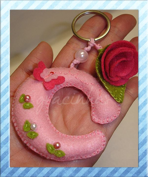 Aqui, além das pérolas (florzinhas) utilizei um pequeno botão em forma de borboleta. Nas letras anteriores a borboleta era de feltro e tinha asas duplas. Devido ao pequeno tamanho a borboletinha é um bocadinho difícil de cortar,no entanto, tudo se faz com um pouco de paciência.