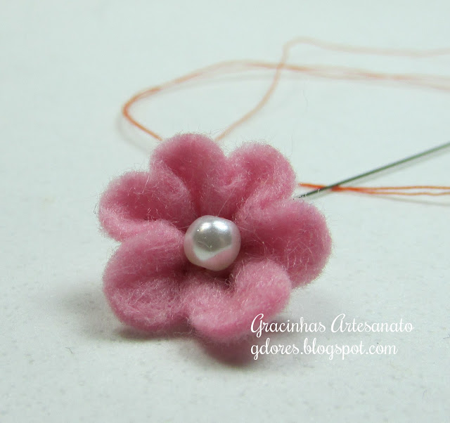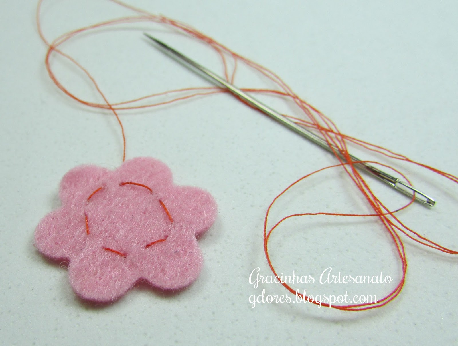 Com linha de cor idêntica à do feltro (aqui usarei uma cor contrastante para facilitar a visualização dos pontos!) faça um alinhavo junto à base das pétalas, começando (nó da linha) e terminando com a linha na face posterior da flor (esta que aqui vemos é a face anterior da flor)