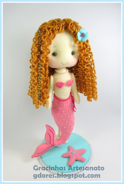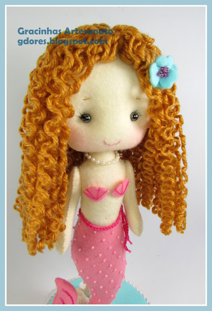 E aqui está mais uma das minhas sereias. Completamente personalizada ( forma do rosto, cor dos olhos, sorriso, cabelo, etc) para ficar o mais parecida possível com a Audrey, que é a princesinha cuja festa de aniversário a minha sereia vai decorar. E já está a caminho...